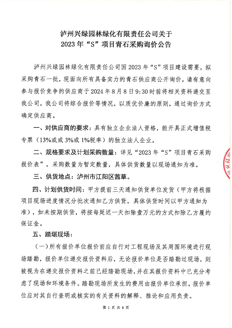 瀘州興綠園林綠化有限責(zé)任公司關(guān)于2023年“S”項(xiàng)目青石采購詢價(jià)公告