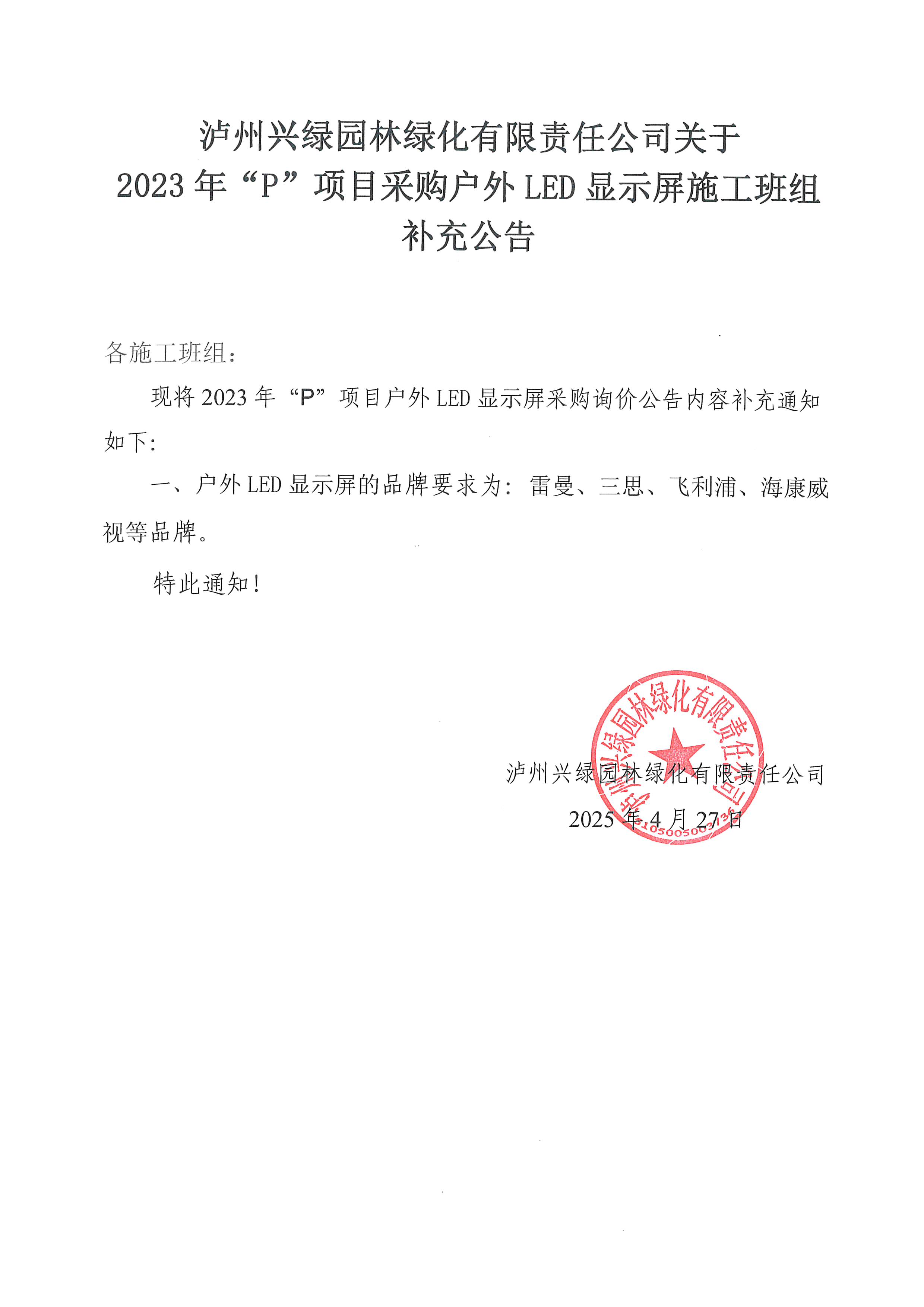 瀘州興綠園林綠化有限責(zé)任公司關(guān)于2023年“P”項(xiàng)目采購(gòu)戶外LED顯示屏施工班組補(bǔ)充