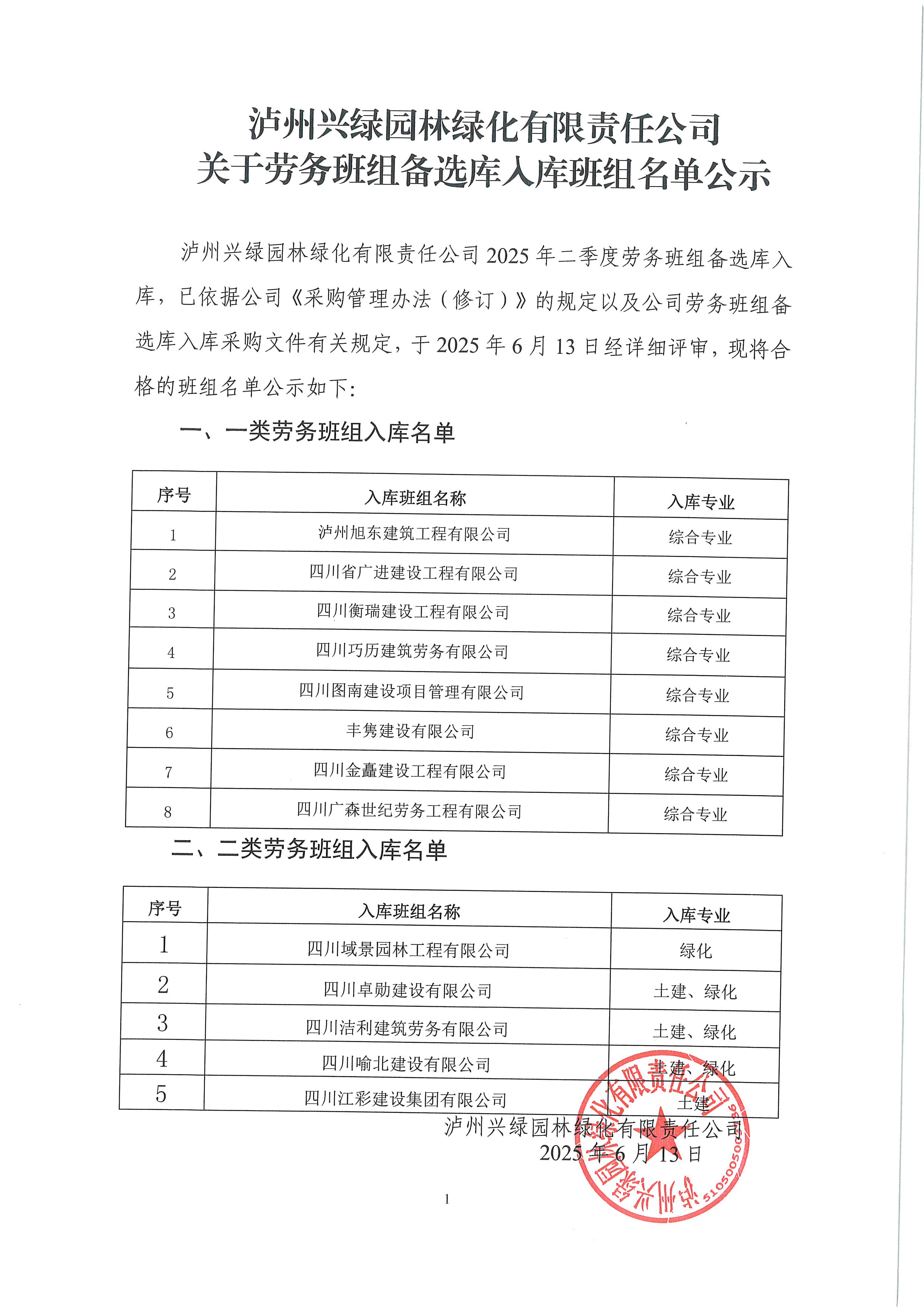 瀘州興綠園林綠化有限責(zé)任公司關(guān)于勞務(wù)班組備選庫入庫班組名單公示