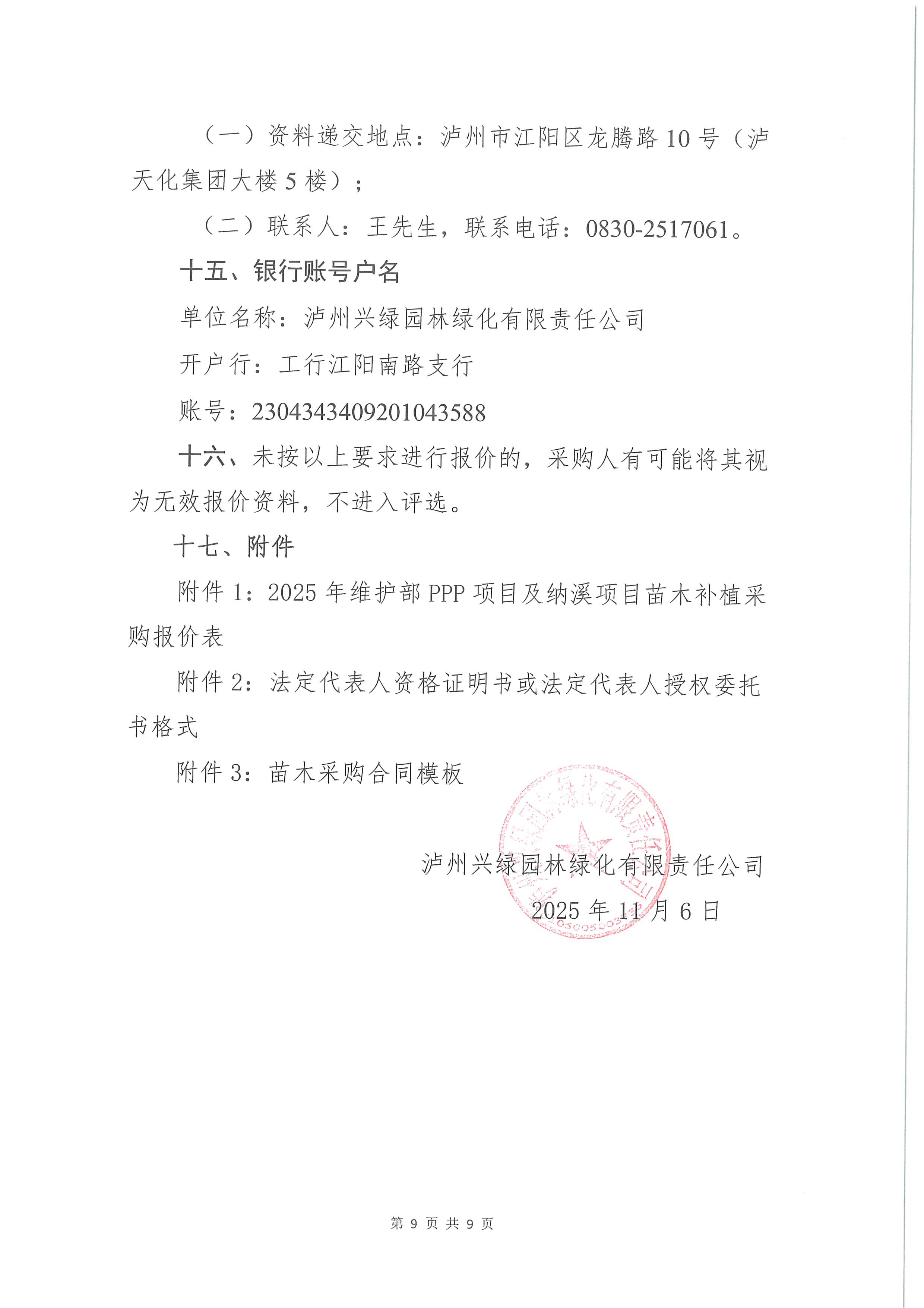 瀘州興綠園林綠化有限責(zé)任公司關(guān)于2025年維護(hù)部PPP項目及納溪項目苗木補(bǔ)植采購詢價公告